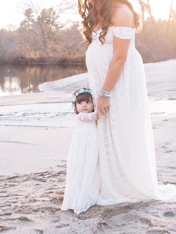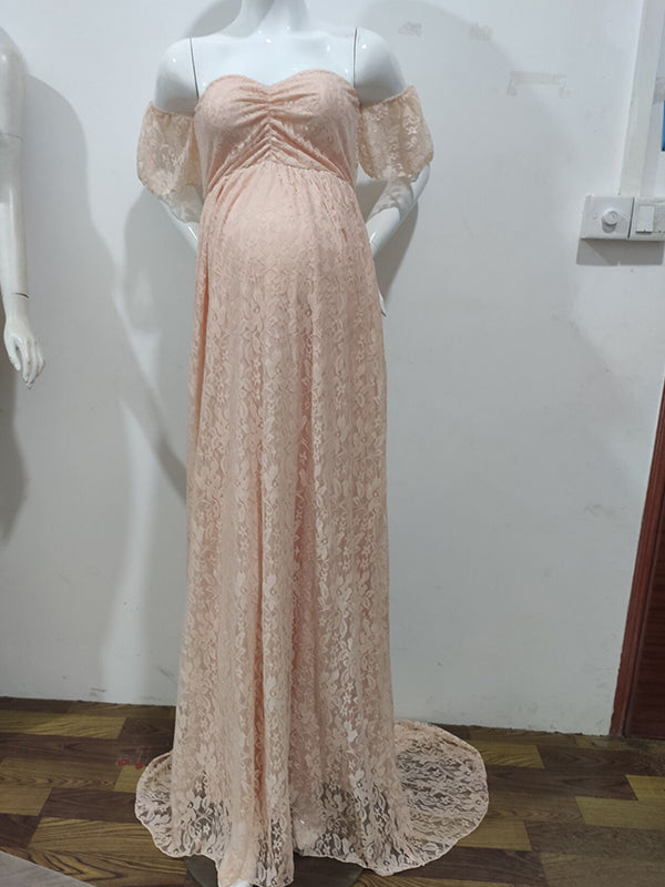 fotobeyou Solid Color Lace Off Shoulder Cap Sleeve Photoshoot Maternity Maxi Dress