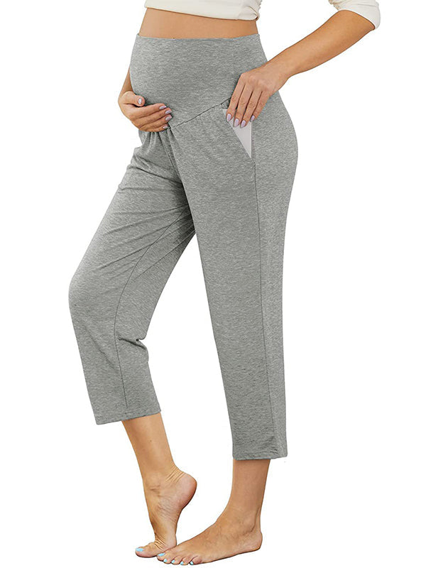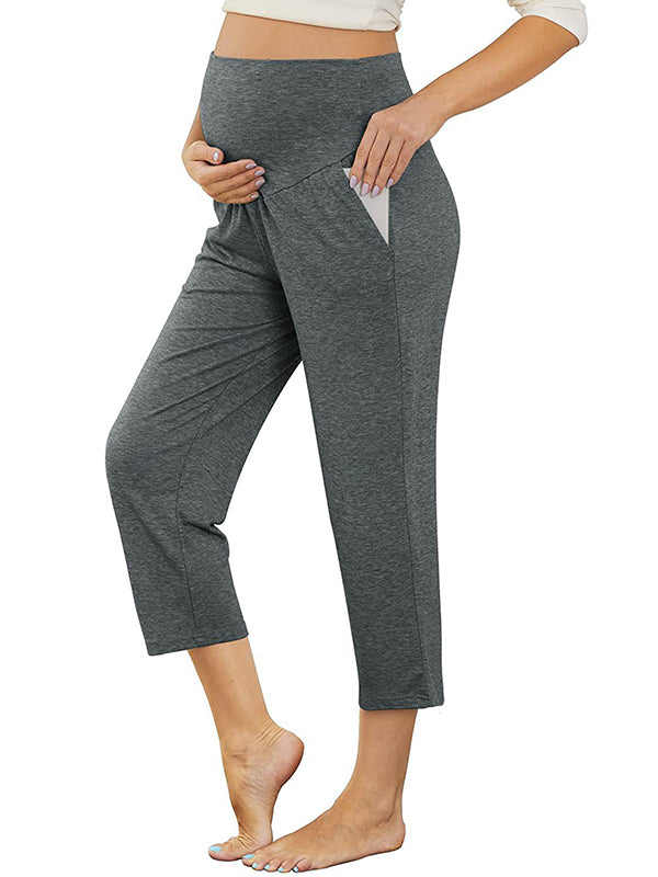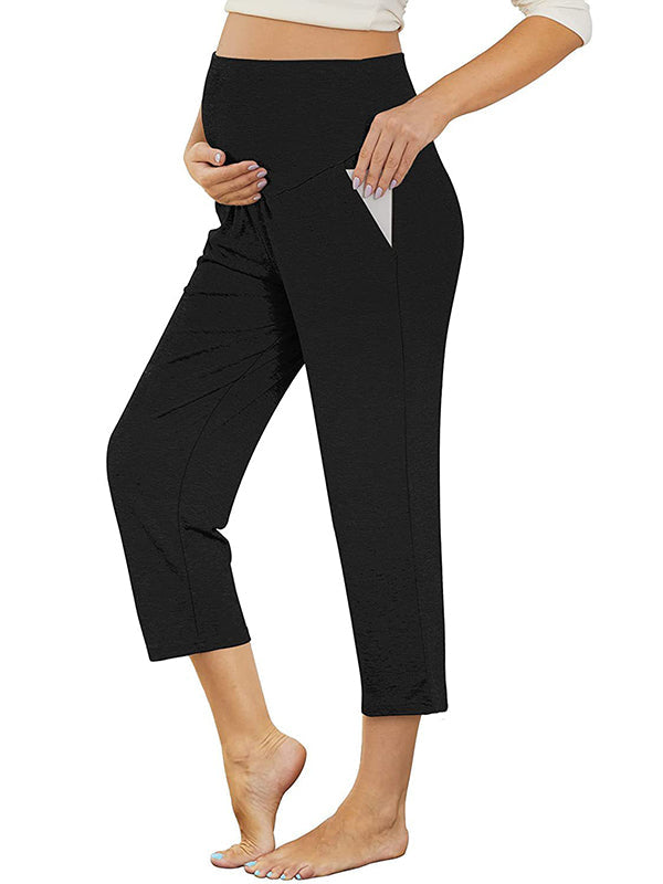 fotobeyou Solid Color Over The Belly Pockets High Waisted Workout Cozy Straight Pants Casual Maternity Trousers
