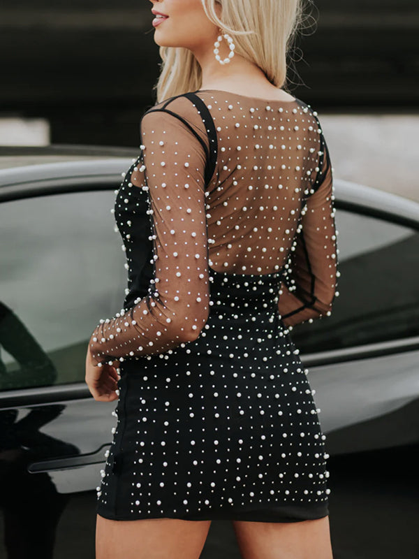 fotobeyou Solid Color Pear Rhinestone Sheer Long Sleeve Fashion Photoshoot Maternity Baby Shower Mini Dress