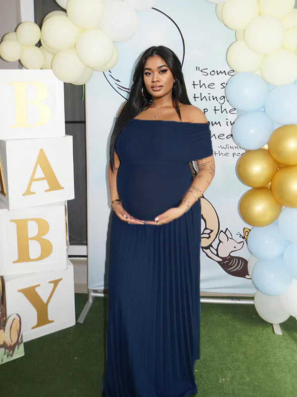 fotobeyou Solid Color Ruched Pleated Off Shoulder Big Swing Elegant Cocktail Party Maternity Photoshoot Baby Shower Maxi Dress