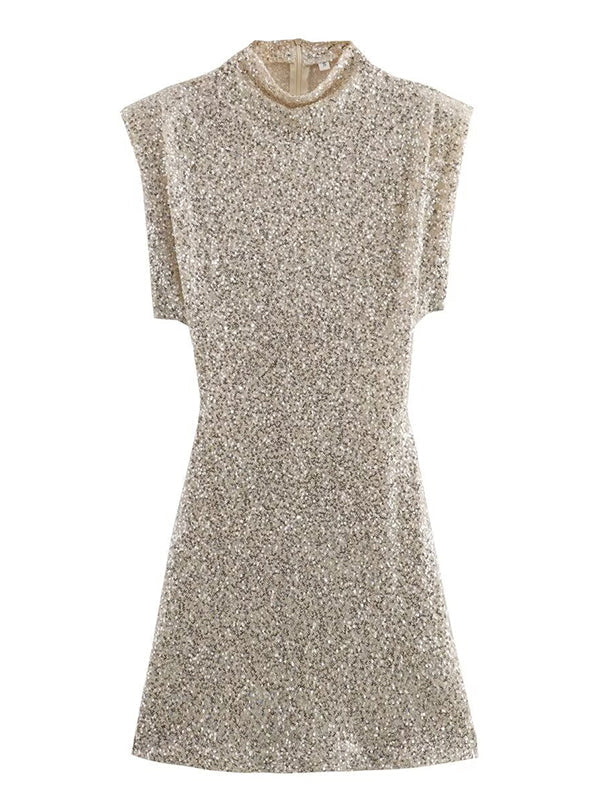 fotobeyou Sparkle Sequin Shoulder Pads High Neck Sleeveless Bodycon Elegant Cocktail Party Maternity Photoshoot Baby Shower Mini Dress