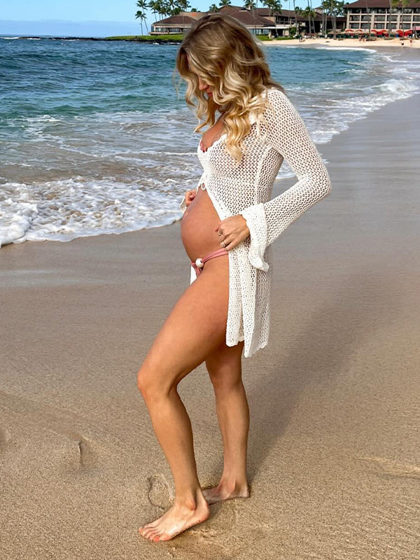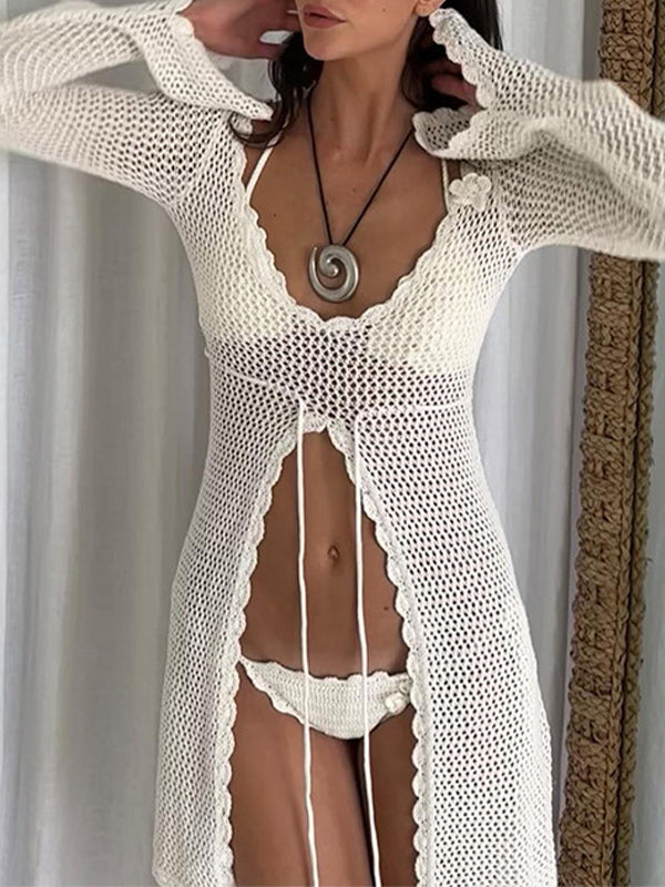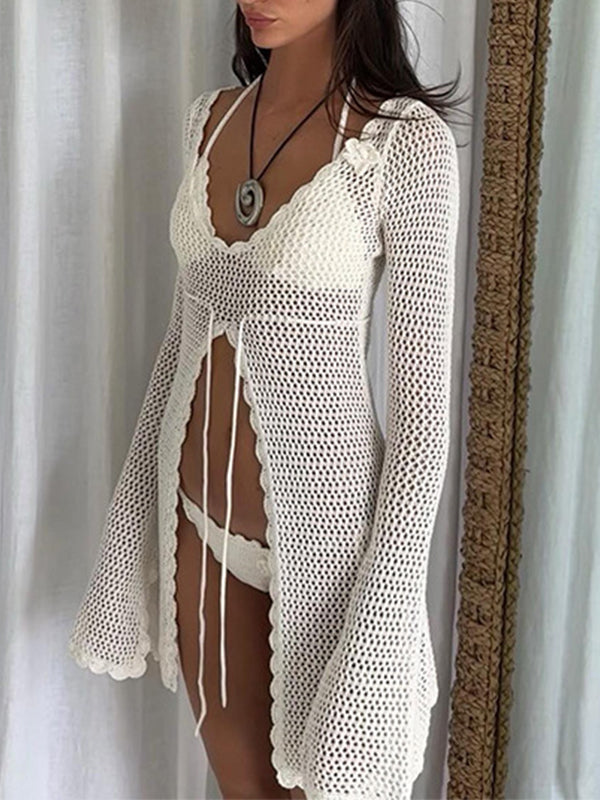 fotobeyou White 2-in-1 3D Flower Tie Ruffle Slit Flare Sleeve Fashion Beach Vacation Cover Up Photoshoot Maternity Mini Dress