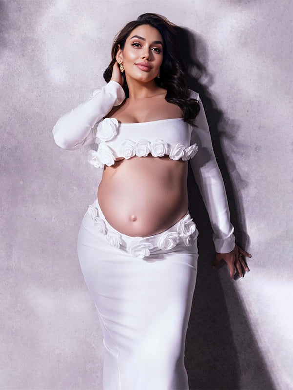 fotobeyou White 3D Flowers Cut Out Bodycon Elegant Photoshoot Baby Shower Maternity Maxi Dress
