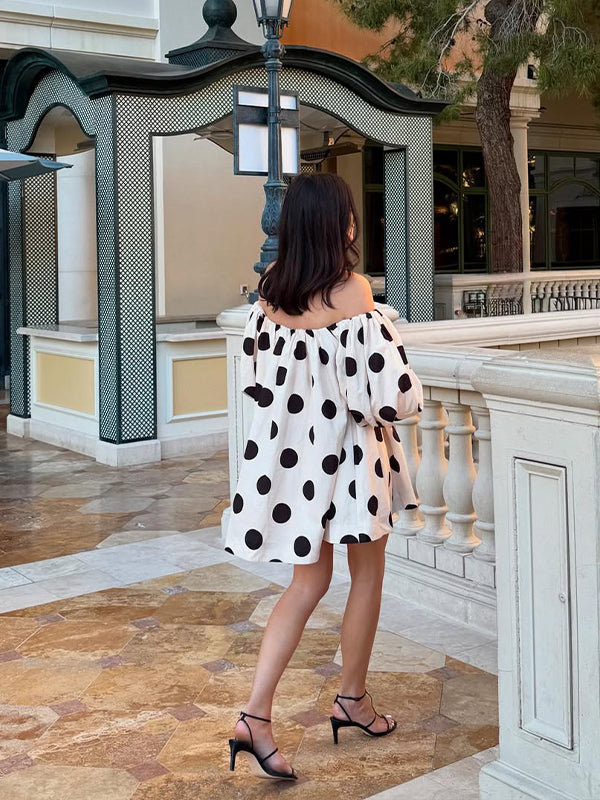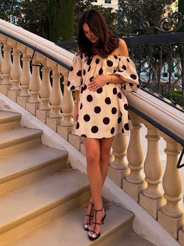 fotobeyou White And Black Wave Point Off-shoulder Puff Sleeve Elegant Maternity Mini Dress
