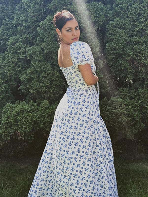 fotobeyou White And Blue Print Flowers Front Slit Puff Sleeve Drawstring Elegant Maternity Baby Shower Maxi Dress