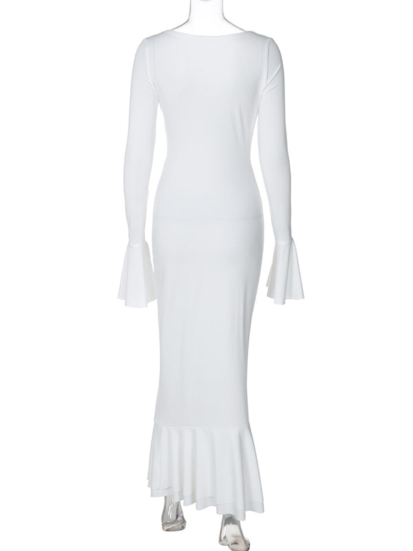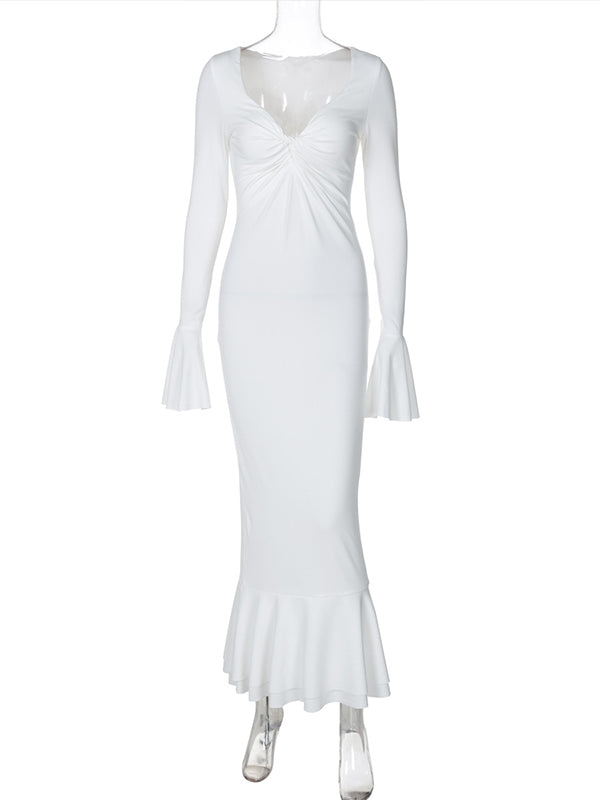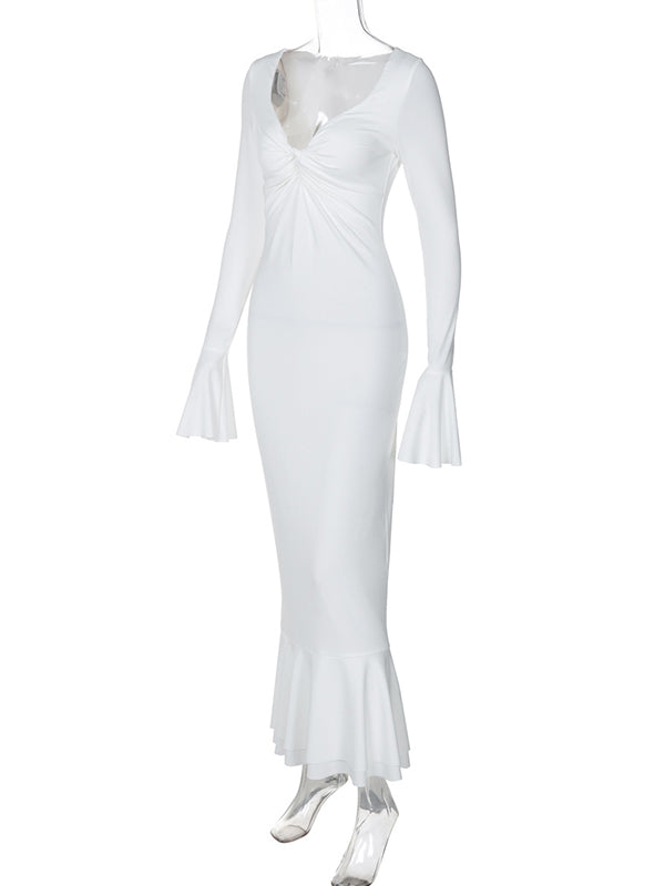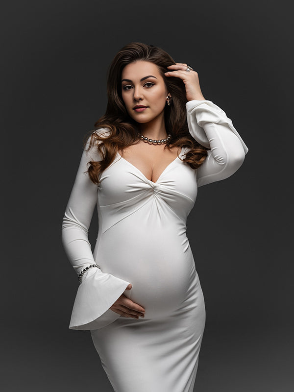 fotobeyou White Cross Chest Ruched Ruffle Falbala Sweetheart Neckline Flare Sleeve Bodycon Mermaid Elegant Maternity Photoshoot Maxi Dress