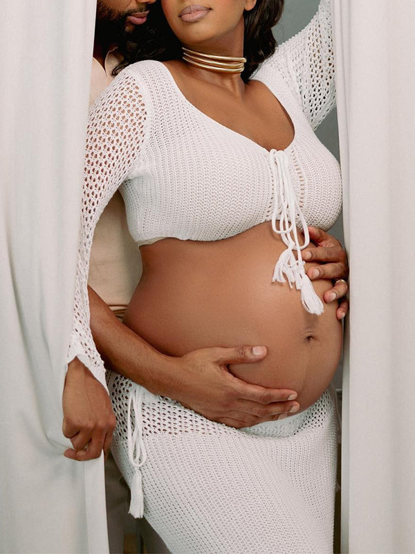 fotobeyou White Drawstring Crop Sheer Knitting 2-in-1 Bodycon Mermaid Beach Vacatiom Photoshoot Maternity Maxi Dress