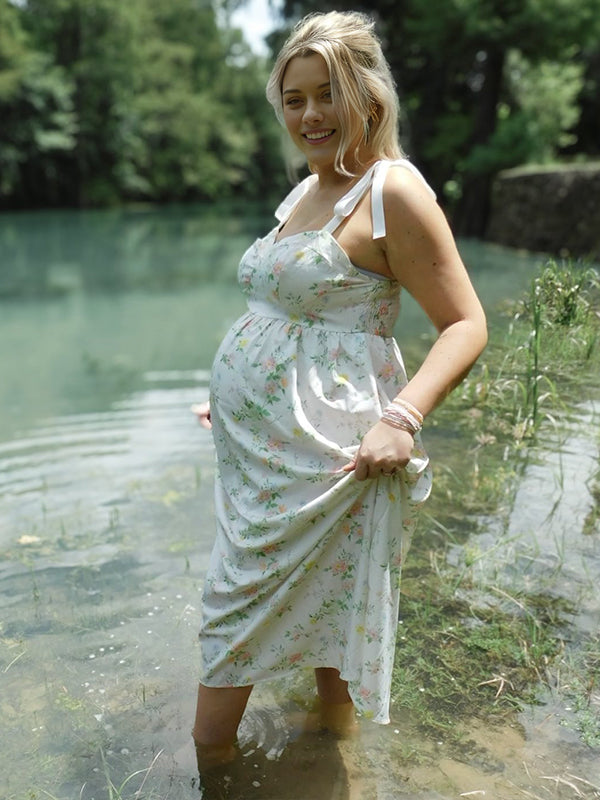 Fotobeyou White Floral Bodice Smocked Tie Shoulder Strap A-line Maternity Maxi Dress