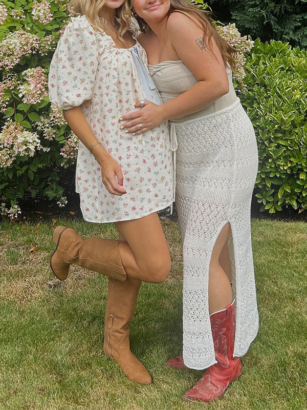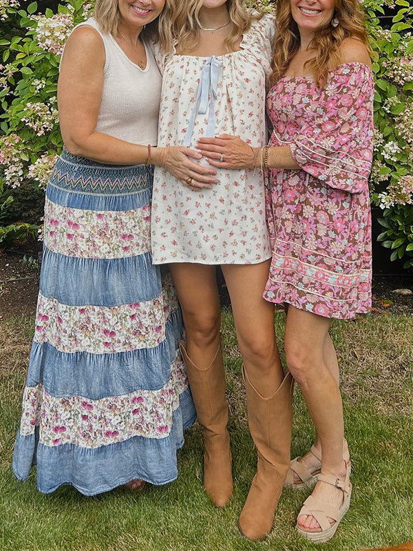 fotobeyou White Floral Bow Puff Sleeve Cute Baby Shower Maternity Mini Dress