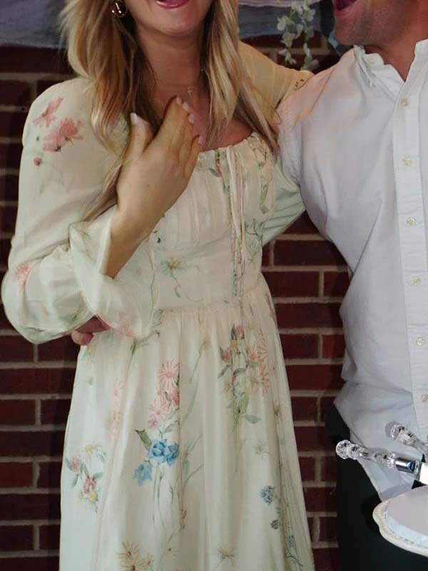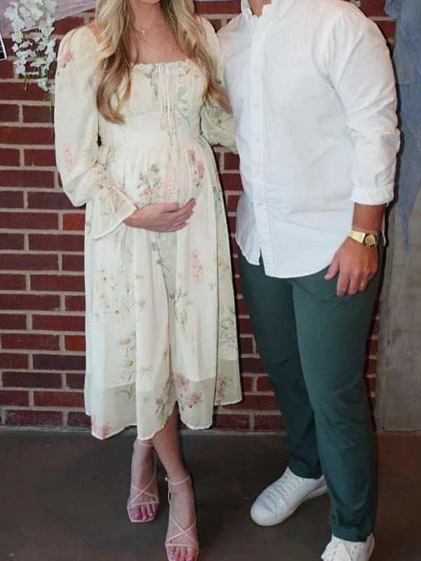 fotobeyou Beige Floral Corset Ruffle Falbala Big Swing Elegant Maternity Baby Shower Maxi Dress