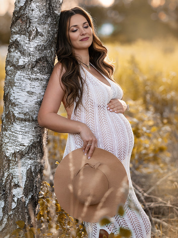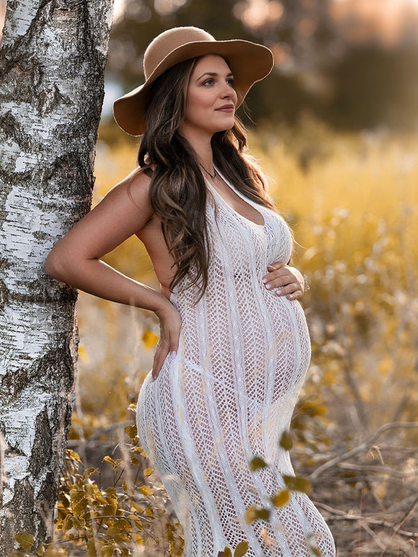 Fotobeyou White Knit Cut Out Backless Photoshoot Maternity Maxi Dress