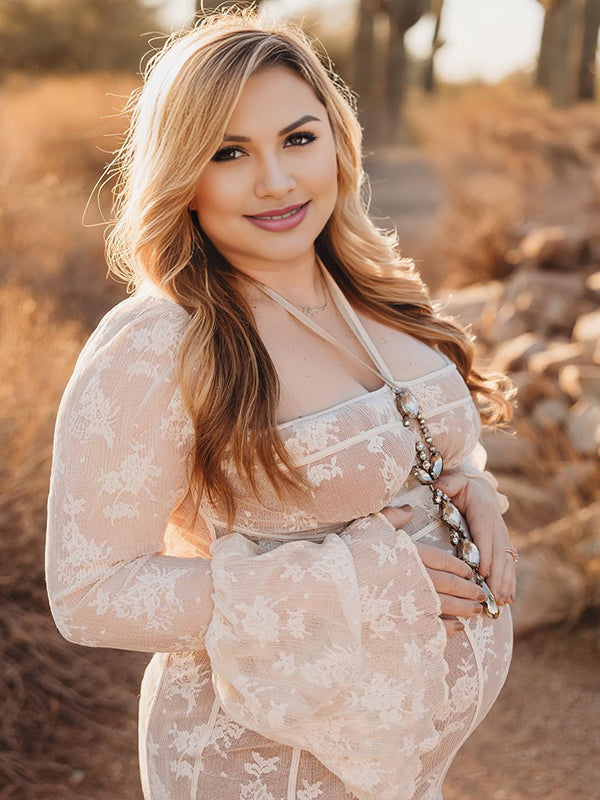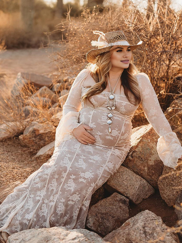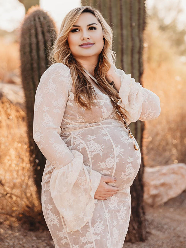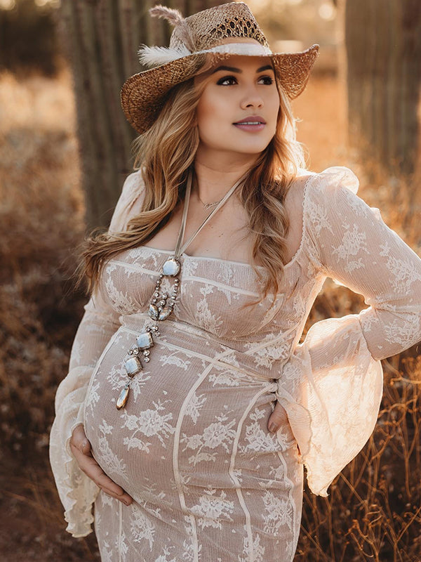 fotobeyou White Lace Corset Square Neck Flare Sleeve Plus Size Maternity Photoshoot Maxi Dress