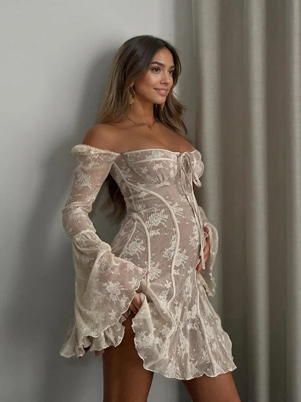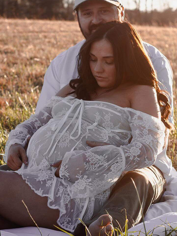 fotobeyou White Lace Off Shoulder Bow Drawstring Ruffle Flare Sleeve Elegant Baby Shower Maternity Mini Dress