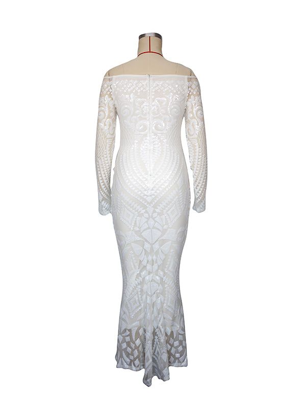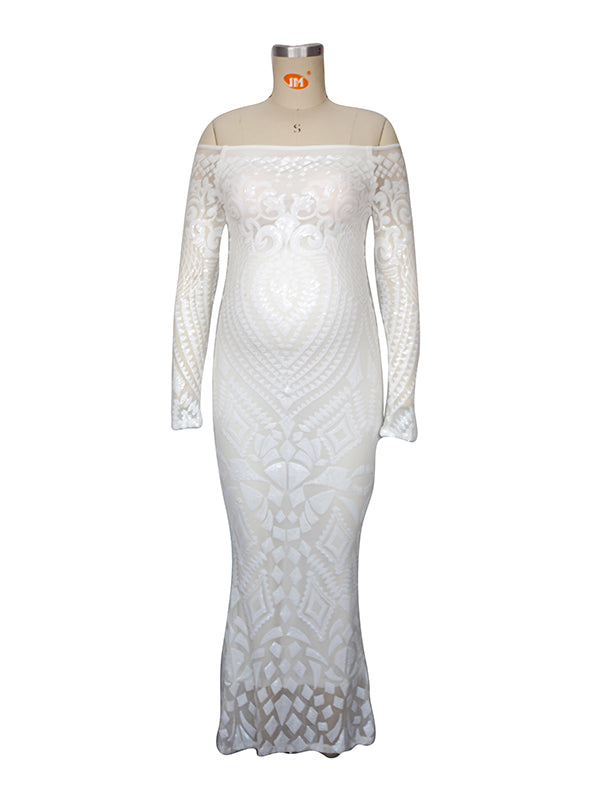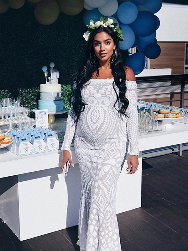 fotobeyou White Lace Sequin Off Shoulder Mermaid Bodycon Wedding Gown Baby Shower Elegant Foamal Maternity Photoshoot Maxi Dress