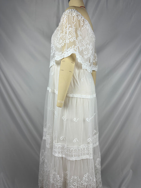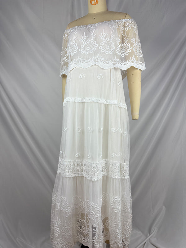 fotobeyou White Off Shoulder Lace Tiered Boat Neck Flowy Elegant Maternity Photoshoot Dress