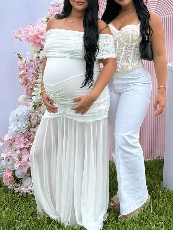 Fotobeyou White Off Shoulder Ruched Grenadine Sheer Baby Shower Maternity Maxi Dress