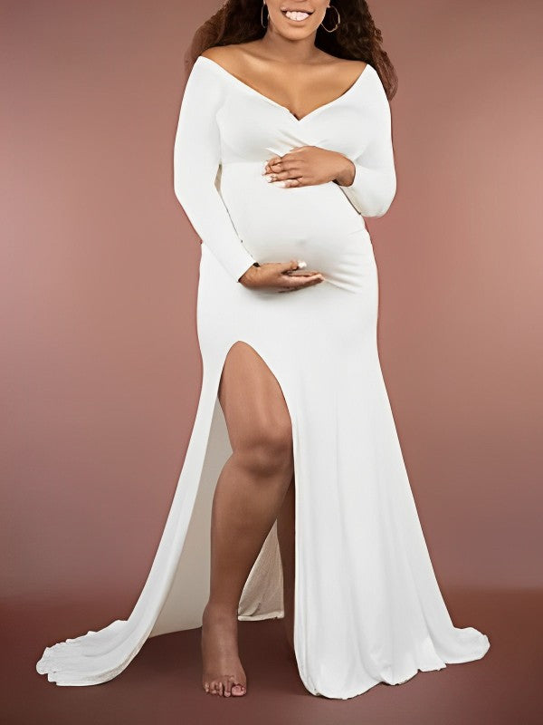 Features: Long Sleeve, V Neckline, Off the Shoulder, Slim Fit, Floor Length, White. Off the shoulder design shows your lines of collarbones and shoulders, Slim fit gown with a long train outlines your perfect shape & adorable mama's baby bump effortlessly; One Side Slit design shows your legs, make you look more attractive and charming