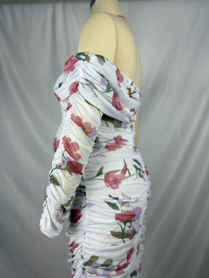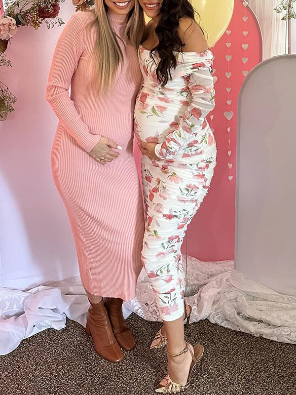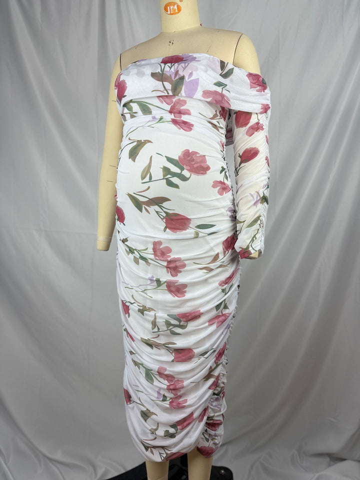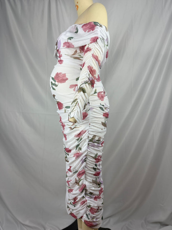 fotobeyou White Off-Shoulder Stamp Duty Single Sleeve Side Slit Ruched Banquet Ceremony Baby Shower Maternity Photoshoot Midi Dress