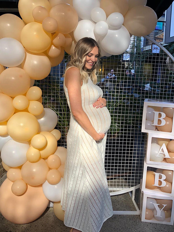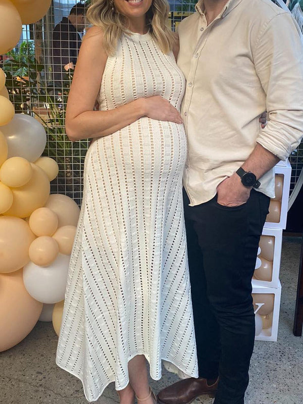 Fotobeyou White Openwork Crochet Round Neck Maternity Baby Shower Maxi Dress