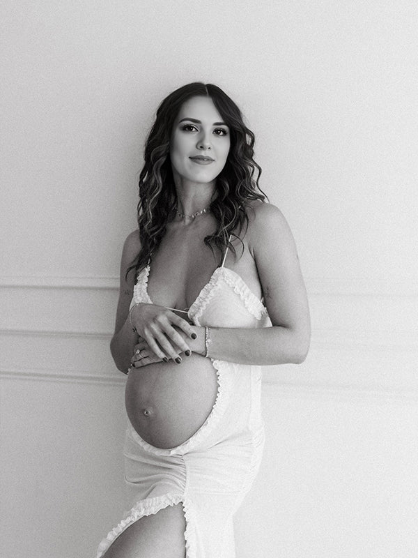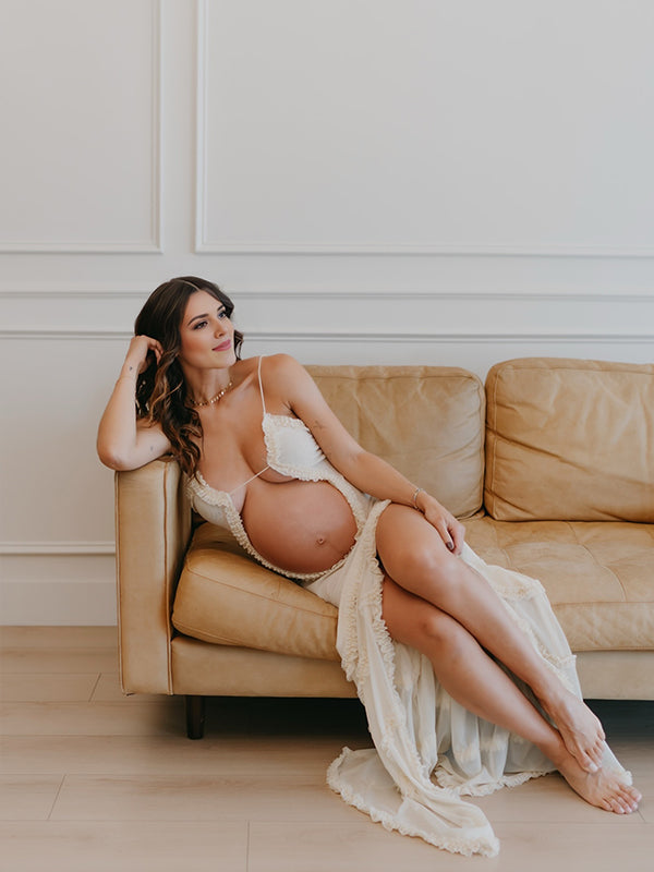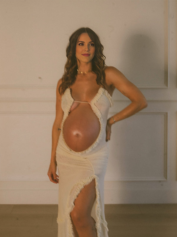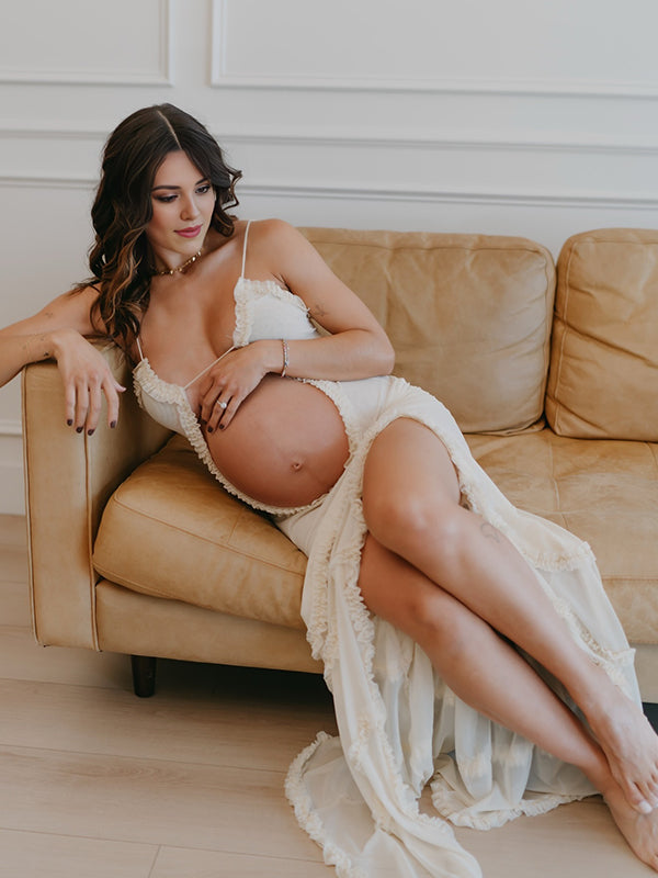 fotobeyou White Ruched Ruffle Falbala Cut Out Side Slit Crop Cami Mermaid Elegant Maternity Photoshoot Maxi Dress