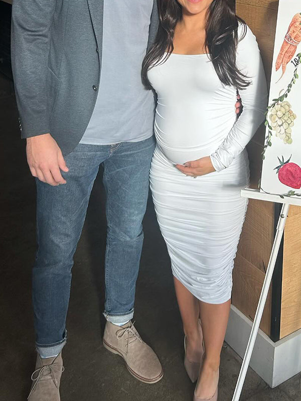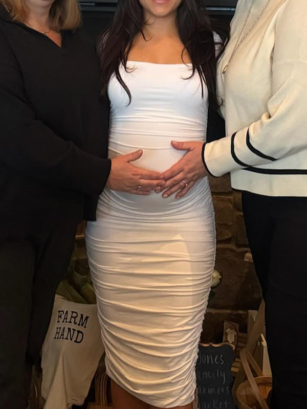 fotobeyou White Ruched Square Neck Bodycon Elegant Maternity Baby Shower Midi Dress