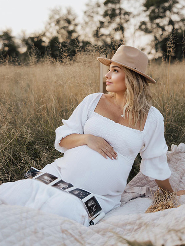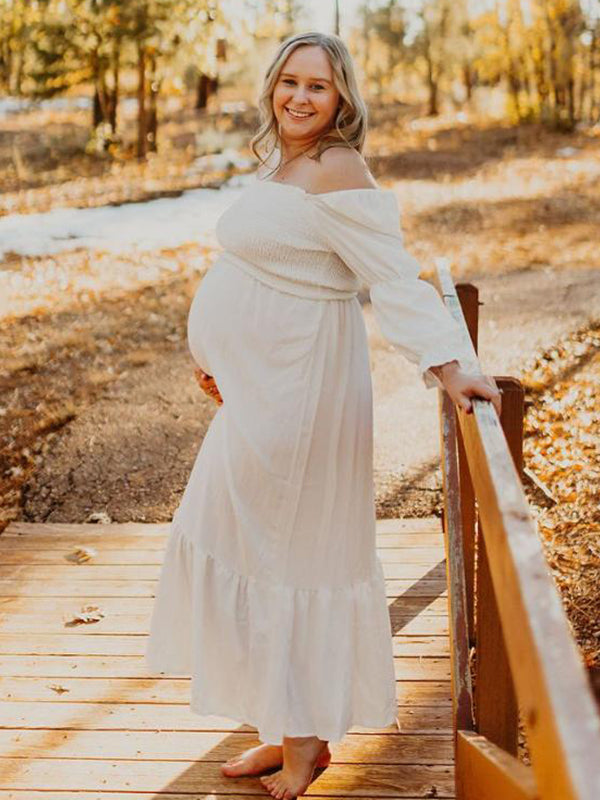 fotobeyou White Ruffle Ruched High Waist Puff Sleeve Cute Photoshoot Maternity Maxi Dress