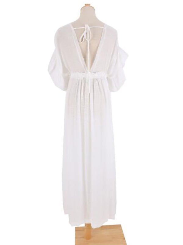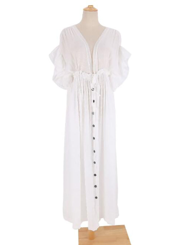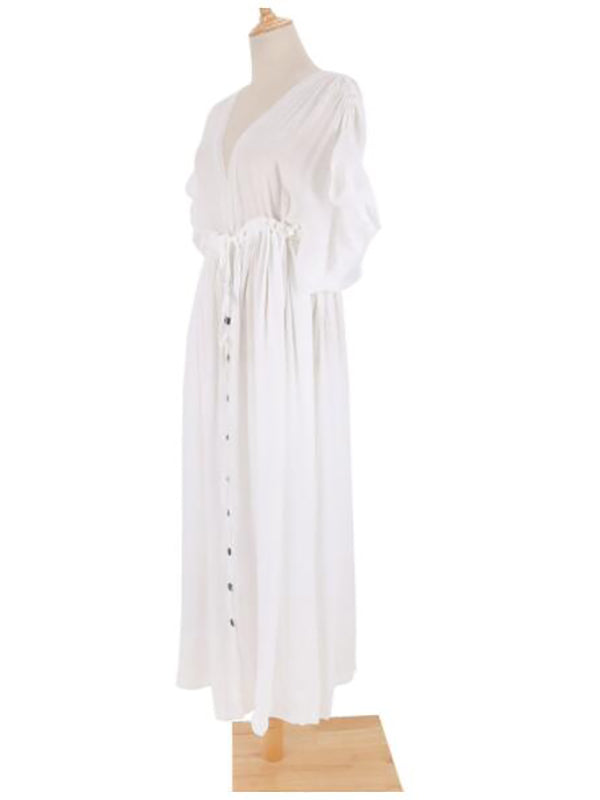 fotobeyou White Ruffle Single Breasted Drawstring Tie Back Bohemain Baby Shower Photoshoot Maternity Maxi Dress