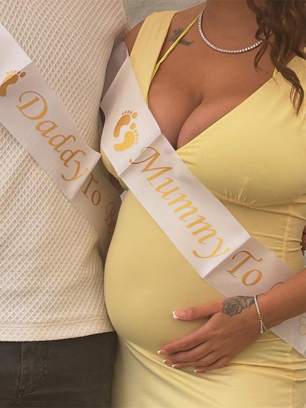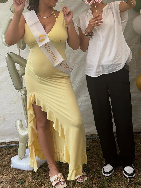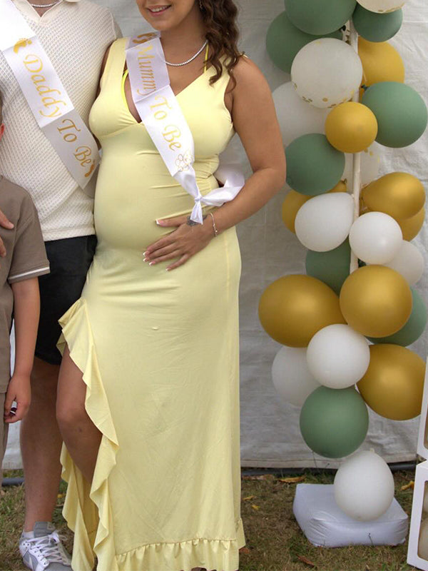 fotobeyou Yellow Ruffle Side Slit Flowy V-neck Bodycon Cute Baby Shower Maternity Maxi Dress