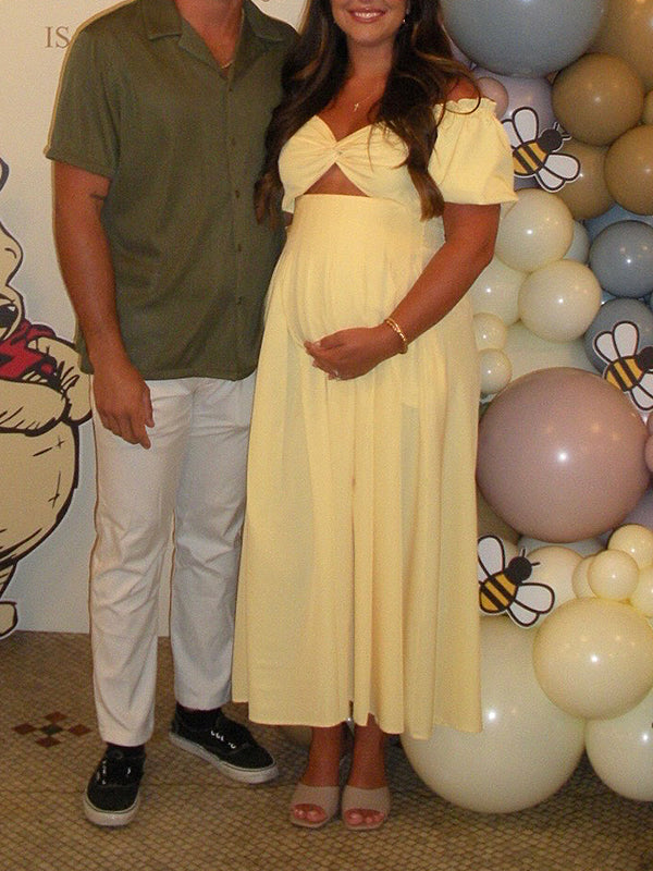 Fotobeyou Yellow Twist Cut Out Smocked Baby Shower Maternity Maxi Dress