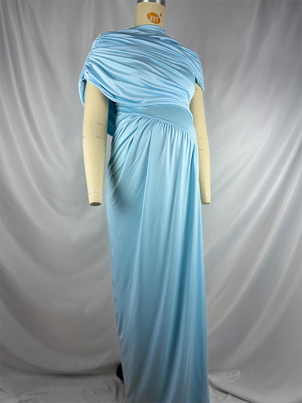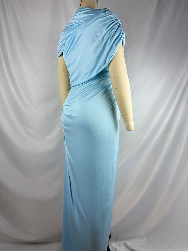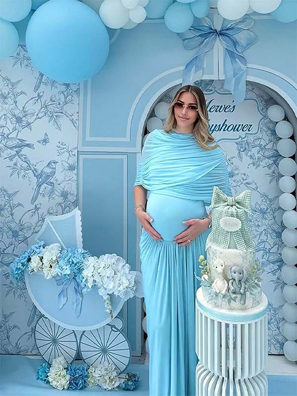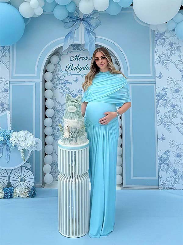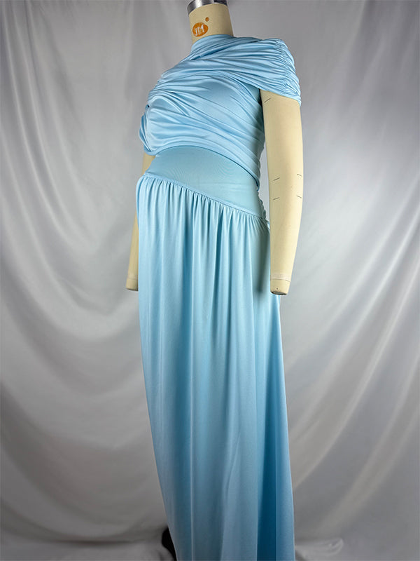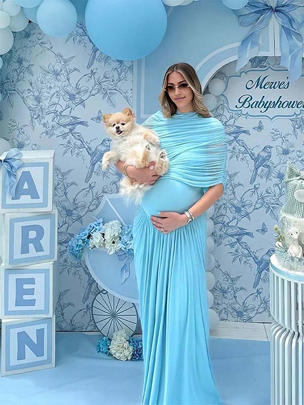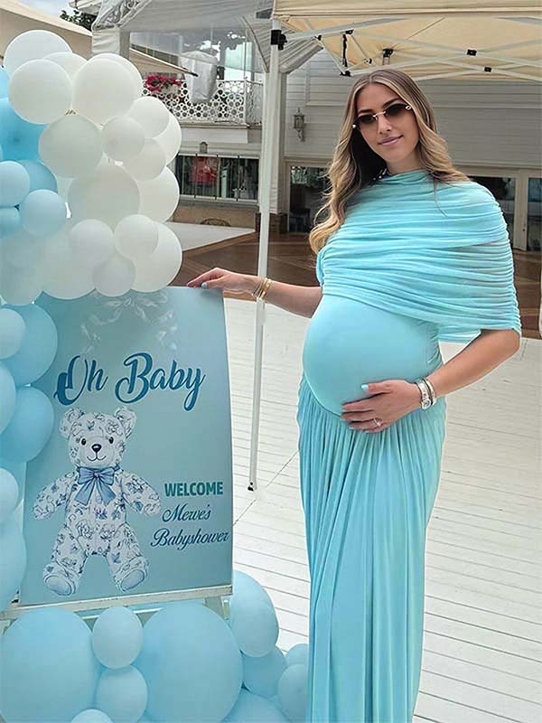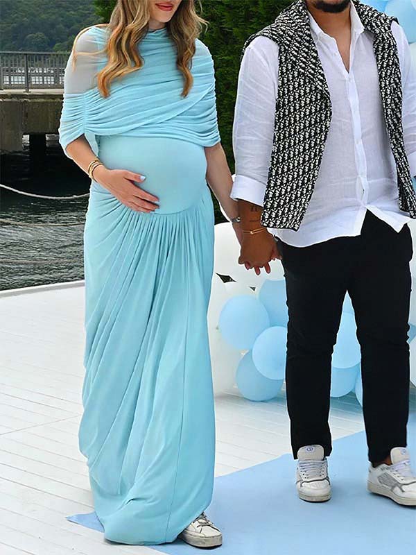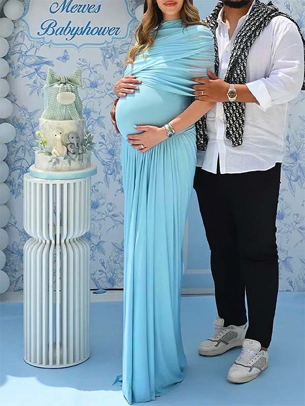 Light Blue Ruched Irregular Neck Baby Shower Maternity Maxi Dress