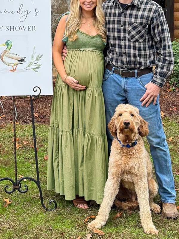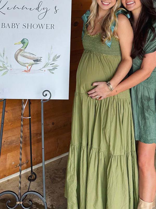 Matcha Smocked Ruffle Tie Flowy Baby Shower Maternity Maxi Dress