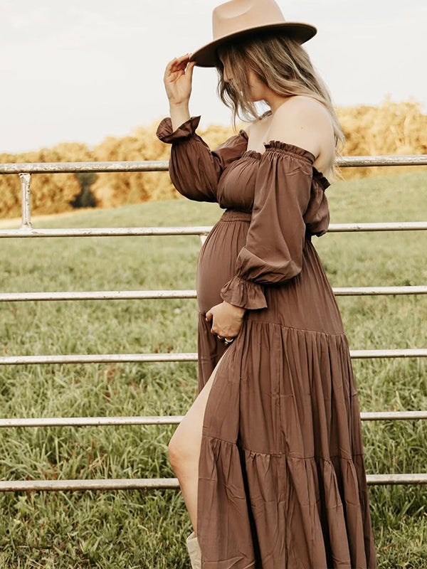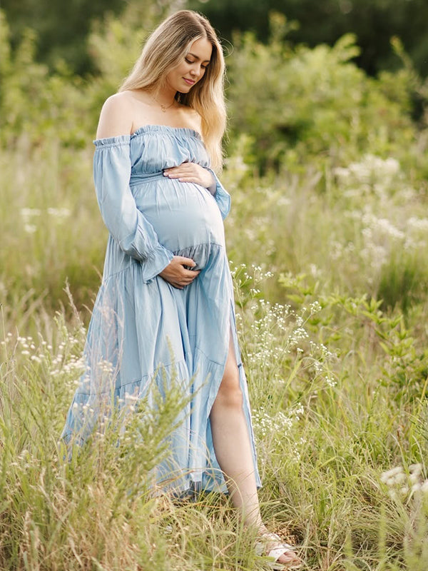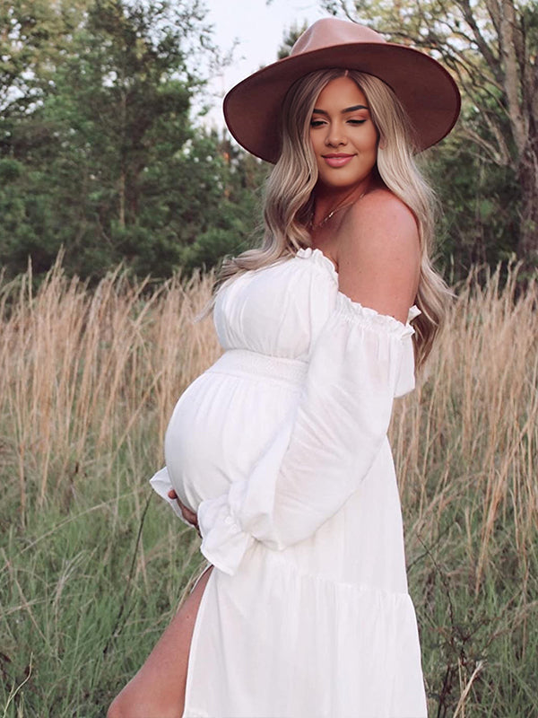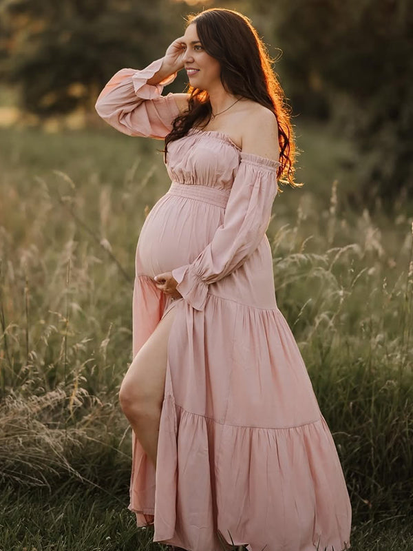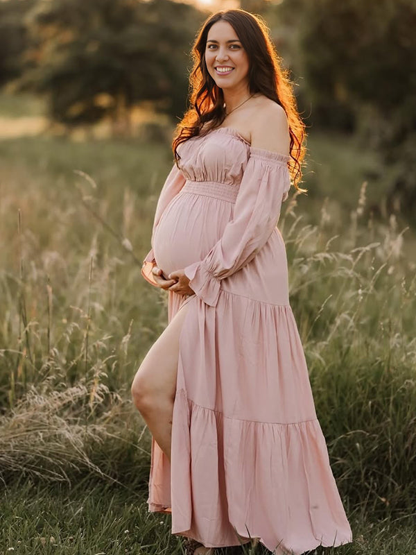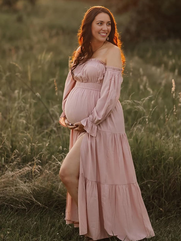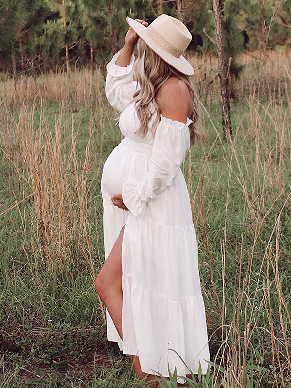 Off Shoulder Side Slit Big Swing Boho Maternity Photoshoot Maxi Dress