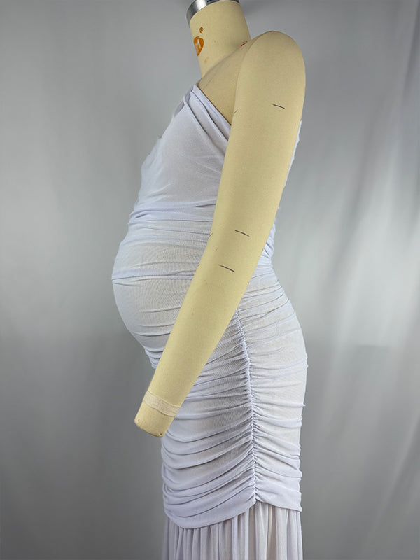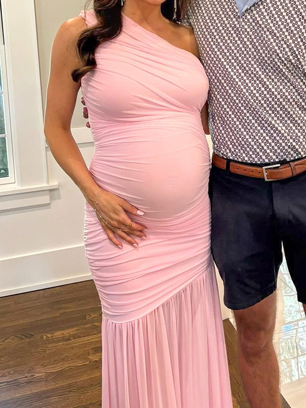 One Shoulder Mesh Ruched Mermaid Evening Gown Maternity Maxi Dress