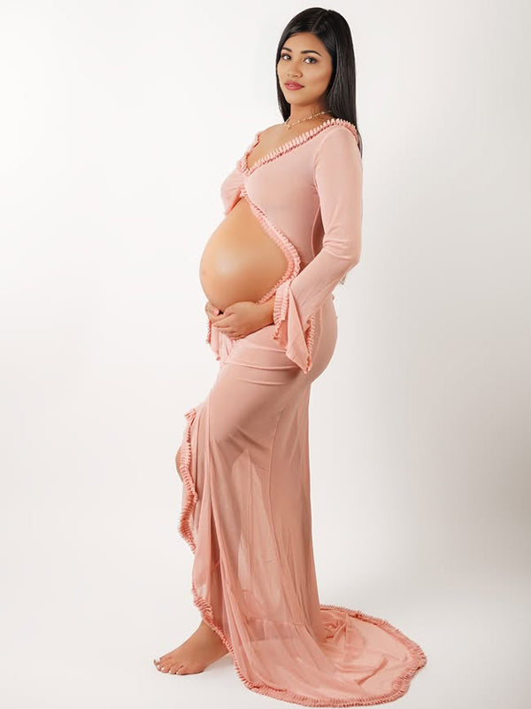 Pink Mesh Ruched Ruffle Crop High-Low Mermaid Sheer Maternity Maxi Dress
