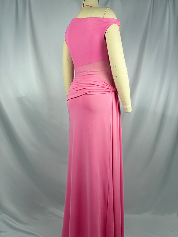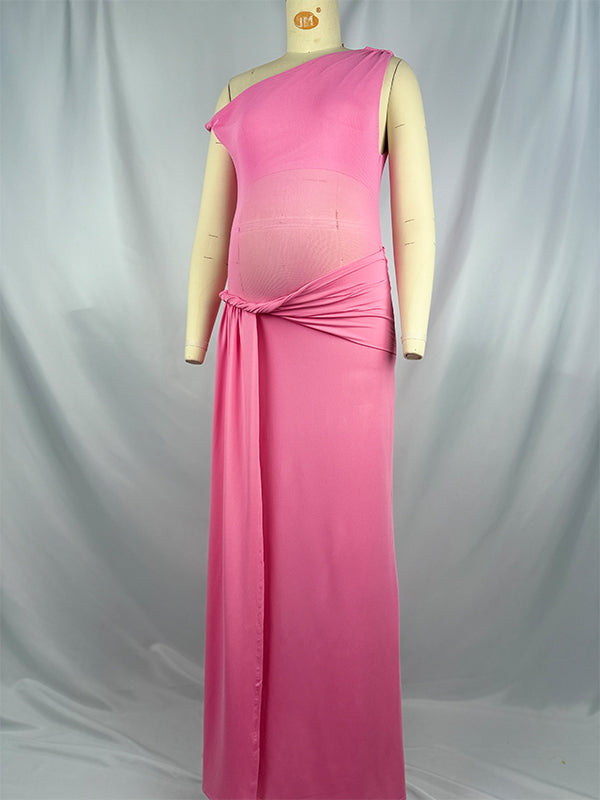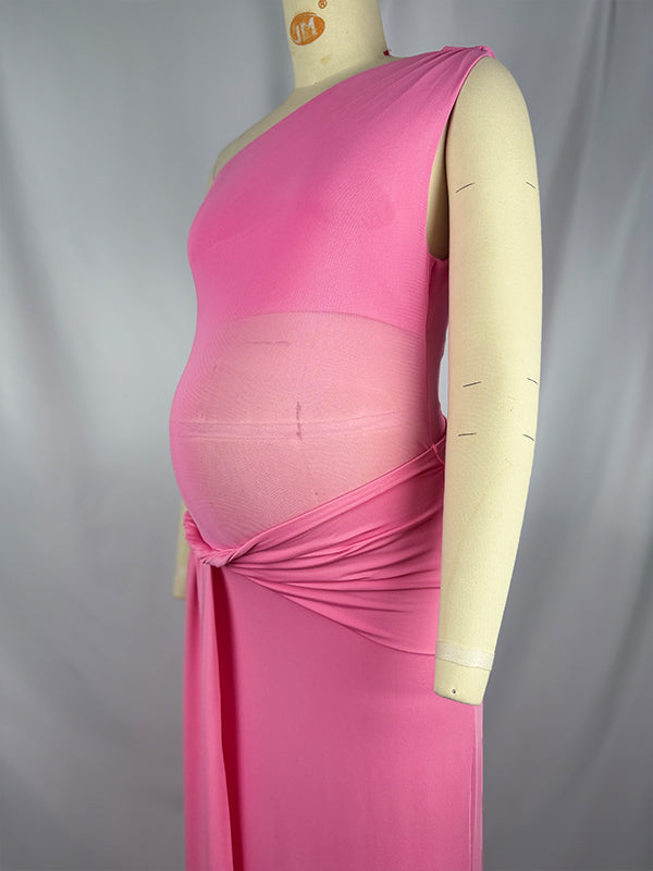 Pink One Shoulder Ruched Mesh ELegant Maternity Maxi Dress