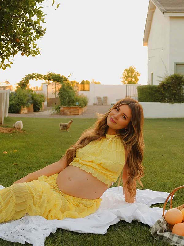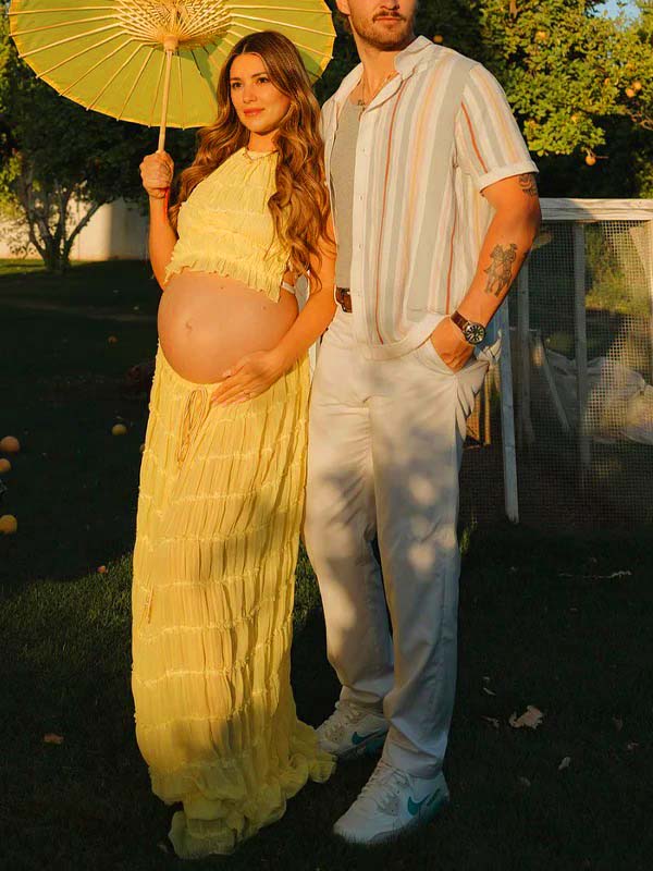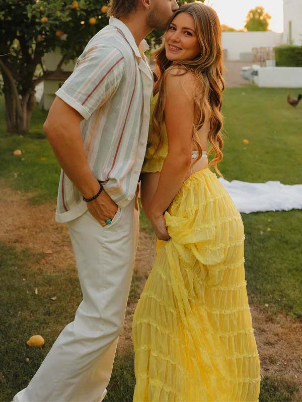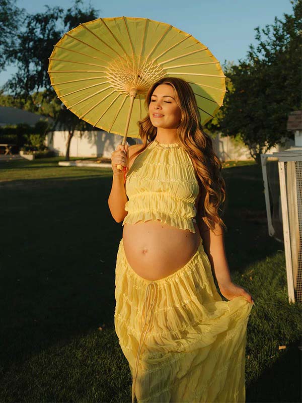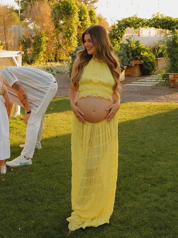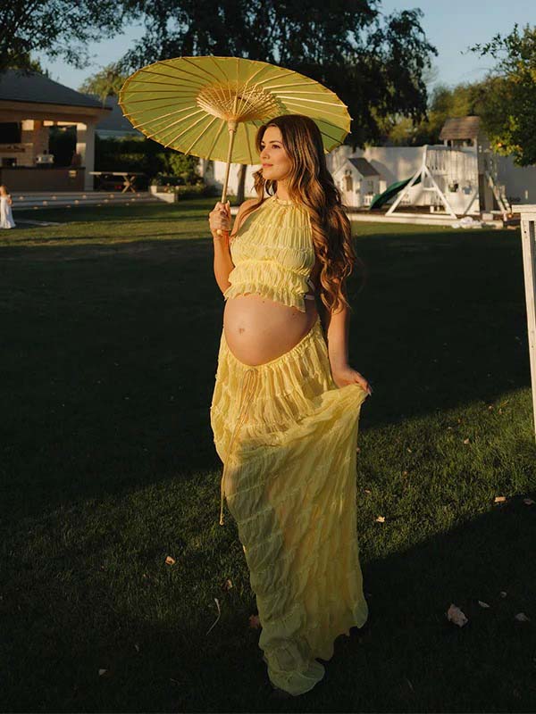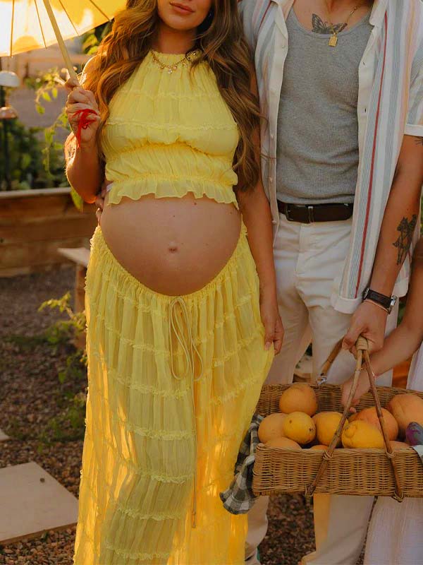 Yellow 2 Pieces Ruched Backless Ruffle Tie Photoshoot Maternity Maxi Dress